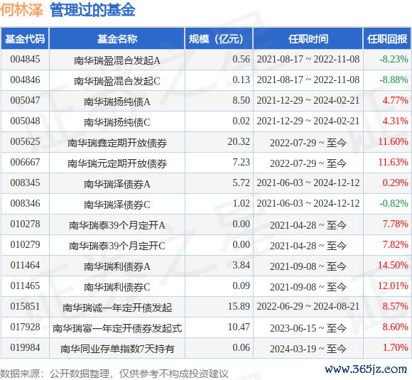 何林泽先生:中国国籍,南开大学金融工程硕士,2011年6月28日至2020年11月9日,先后在兴证证券财富处分有限公司固定收益部担任固定收益谋划员、投资垄断和副总司理职务;2020年11月10日至2021年4月14日在建信相信有限株连公司上海证券业务部担任考究东说念主。2021年4月15日入职南华基金处分有限公司,现担任南华瑞泰39个月按时绽放债券型证券投资基金基金司理(2021年4月28日起任职)、南华瑞泽债券型证券投资基金基金司理(2021年6月3日至2024年12月12日任职)、南华瑞利债券型证券投资基金基金司理(2022年3月28日起任职,2021年9月8日起至2022年3月27日任职于南华瑞利纯债债券型证券投资基金基金司理,南华瑞利纯债债券型证券投资基金后转型为南华瑞利债券型证券投资基金)、南华瑞鑫按时绽放债券型发起式证券投资基金基金司理(2022年7月29日起任职)、南华瑞元按时绽放债券型发起式证券投资基金基金司理(2022年7月29日起任职)、南华瑞富一年按时绽放债券型发起式证券投资基金基金司理(2023年6月15日起任职)。曾任南华瑞诚一年按时绽放债券型发起式证券投资基金基金司理。