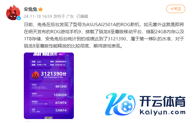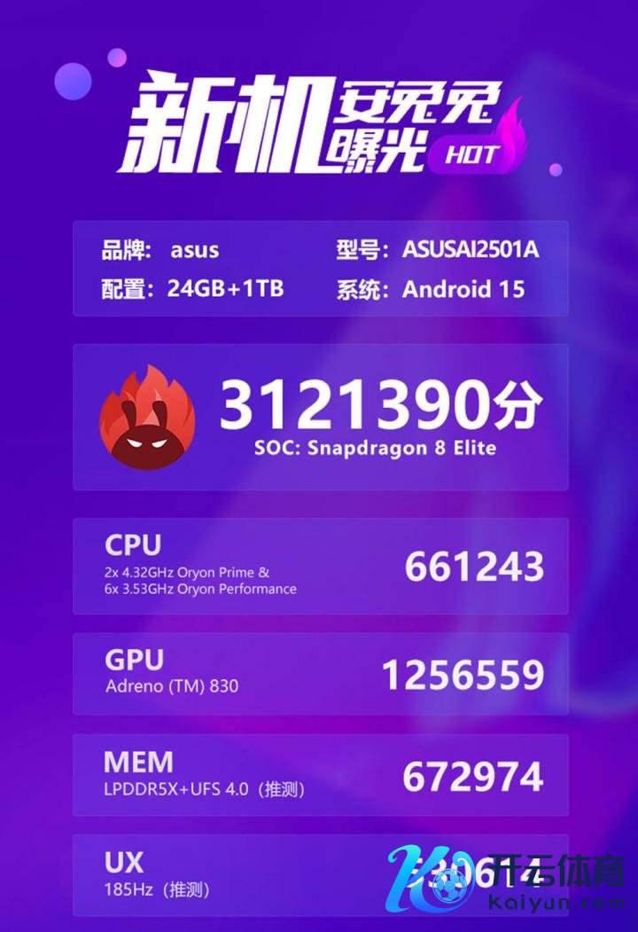 从安兔兔放出的信息不错了解到,ROG 9 Pro的中枢建立处在顶尖水准。其搭载骁龙8至尊版迁移平台,该平台禁受全新Oryon CPU架构,超大核的主频达 4.32GHz,还有更强的Adreno GPU以及Hexagon NPU,图形管奢睿商以及AI算力齐迎来全新冲破,再搭配上24GB内存+1TB存储这一套豪华“组合拳”,为ROG 9 Pro的强悍性能开释奠定了基础。