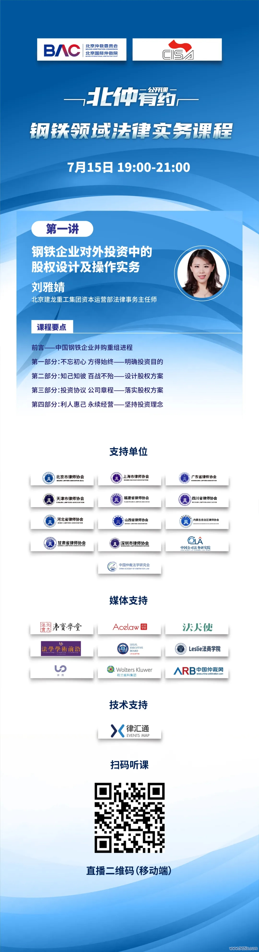 “钢铁边界法律实务课程”是“北仲有约”系列公益课程最新推出的专题课程,由北京仲裁委员会/北京国外仲裁院(BAC/BIAC)与中国钢铁工业协会集合主理,7月15日至7月31日,每周二、周四19:00-21:00准时开播,迎接眷注!