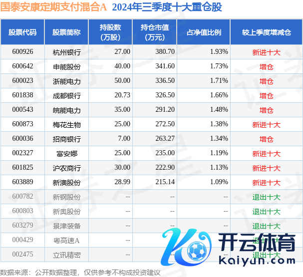 国泰安康按期支付搀和A为搀和型-偏债基金,说明最新一期基金季报显现,该基金金钱竖立:股票占净值比24.11%,债券占净值比82.03%,现款占净值比2.3%。基金十大重仓股如下:
