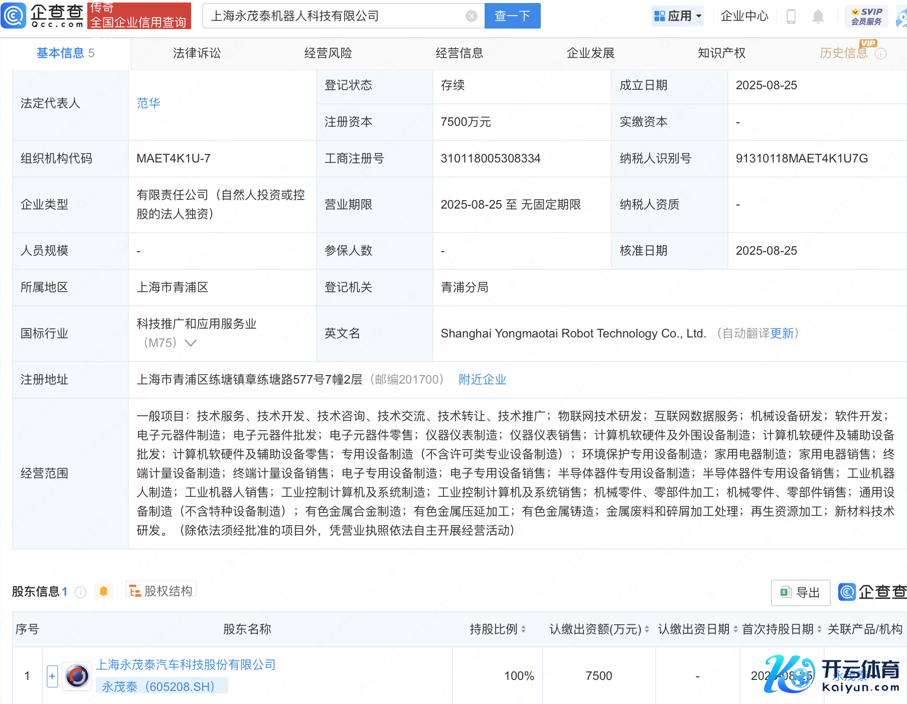 企查查APP潜入,近日,上海永茂泰机器东谈主科技有限公司、上海永茂泰传感工夫有限公司成立,注册老本同为7500万元欧洲杯体育,估量鸿沟均包含:半导体器件专用开发制造;半导体器件专用开发销售;工业机器东谈主制造;工业机器东谈主销售等。企查查股权穿泄潜入,二者都由永茂泰(605208)全资握股。