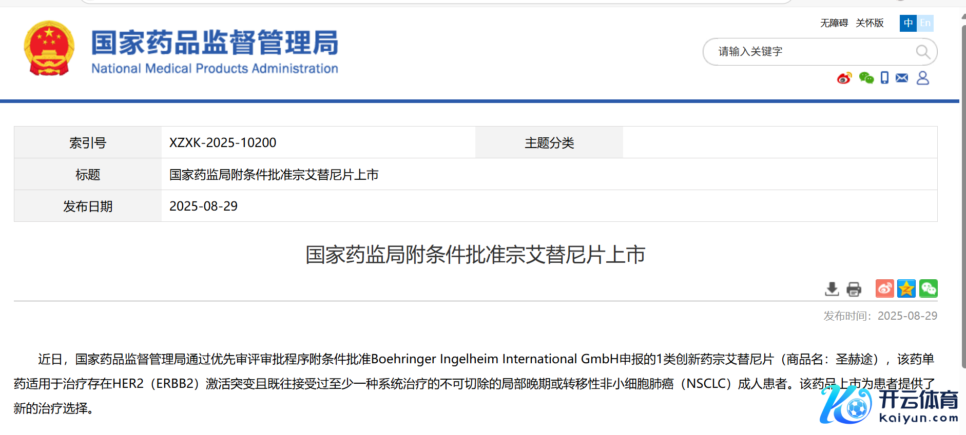 8月29日,勃林格殷格翰与中国生物制药共同晓喻,两边在中国大陆讨论引申的宗艾替尼片(商品名:圣赫途)取得中国国度药品监督处分局追究批准,适用于诊疗存在HER2(ERBB2)激活突变且既往接收过至少一种系总揽疗的不成切除的局部晚期或滚动性非小细胞肺癌(NSCLC)成东谈主患者。